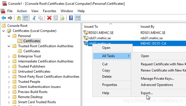 現(xiàn)在,在“個人”下方,我可以向上并單擊“證書”,然后是我要求的證書。接下來,我們需要使用私鑰導(dǎo)出證書,并配置網(wǎng)關(guān)rdwa,rdcb來使用它。