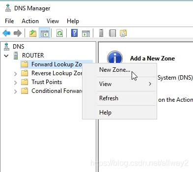 打開DNS管理器,然后瀏覽到“正向查找區(qū)域”。右鍵單擊正向查找區(qū)域,然后選擇新區(qū)域