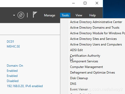 打開服務(wù)器管理器–>工具–>證書頒發(fā)機構(gòu)