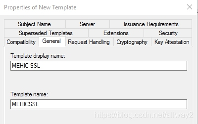 將會彈出新模板窗口。我要做的第一件事是在“常規(guī)”選項卡上將證書名稱更改為MEHIC SSL。