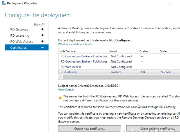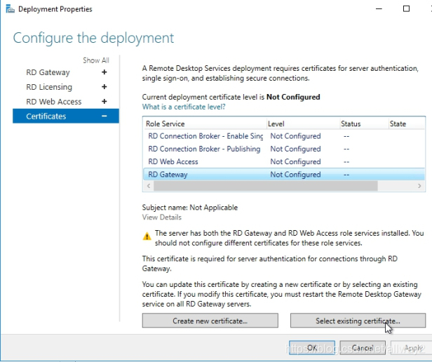 現(xiàn)在,讓我們回到“部署屬性”并選擇RD網(wǎng)關(guān)–>選擇“現(xiàn)有證書”