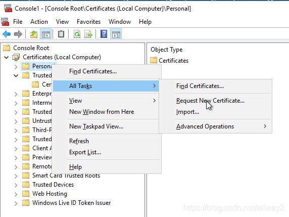 最后一步是注冊證書。切換到RDS01并打開MMC(Windows按鈕+ R并輸入mmc),右鍵單擊Personal-> All Tasks-> Request New Certificate
