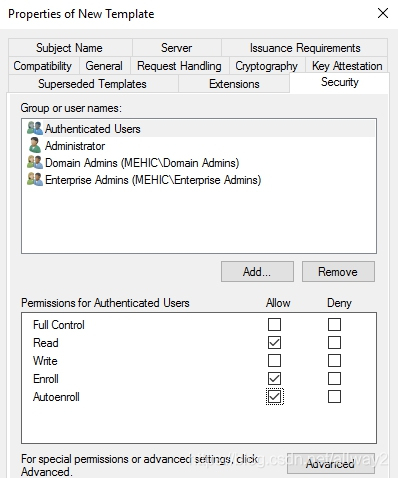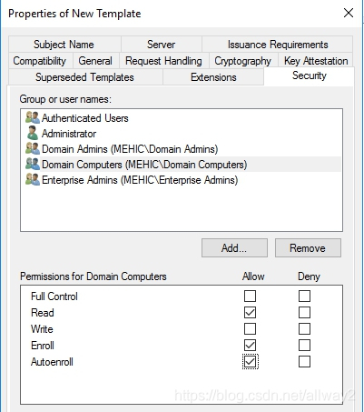 我們可以做很多事情,但最重要的是允許。因此,請單擊“安全性”選項卡,并授予“身份驗證的用戶”注冊和自動注冊的權(quán)限。(OBS!在現(xiàn)實生活中,您可能希望將該證書鎖定給特定的人,但在這種情況下,這并不重要。)我還將添加域計算機,并授予他們讀取,注冊和自動注冊的權(quán)限。完成后,單擊“確定”。