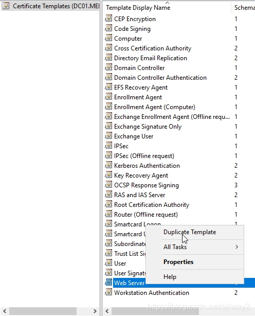 這將打開證書模板管理單元。我們需要做的是從這些模板中選擇一個并復(fù)制它,以便我們可以根據(jù)需要自定義它。對于遠程桌面,我們需要的大多數(shù)證書都是SSL。右鍵單擊Web服務(wù)器模板,然后選擇“重復(fù)模板”