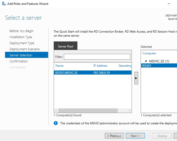 由于我們選擇了快速入門,因此將在單個服務(wù)器上安裝Connection Broker,Web Access和Session Host角色。點擊下一步
