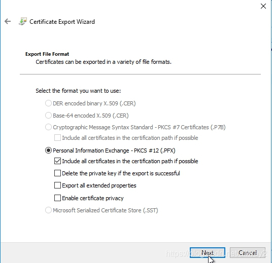 歡迎導(dǎo)出向?qū)棾觥|c擊下一步。選擇是,導(dǎo)出私鑰,然后單擊下一步