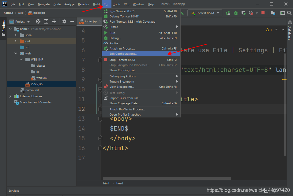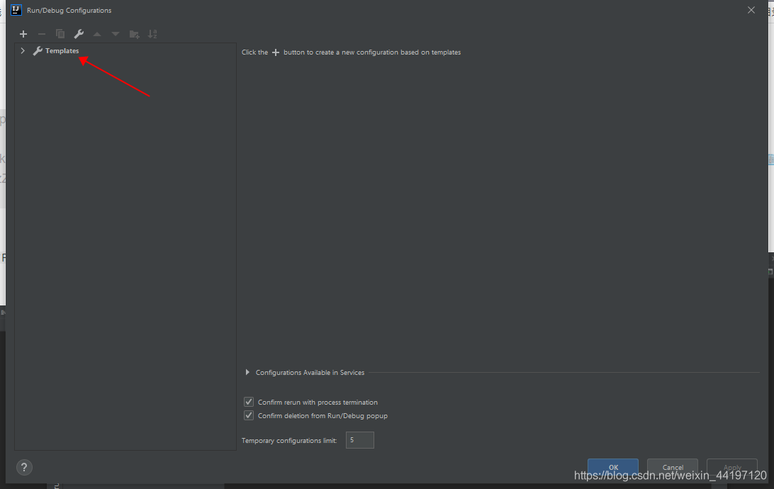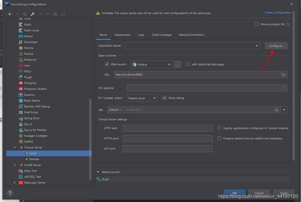 打開(kāi)IDEA點(diǎn)擊最上面的Run,并且選擇Edit Donfiguration...,點(diǎn)擊Templates,并且找到Tomcat server,點(diǎn)擊local