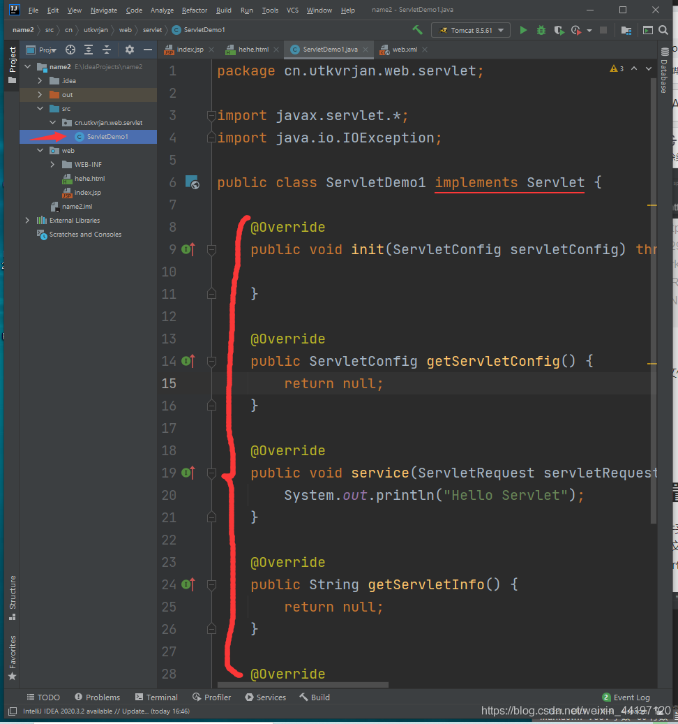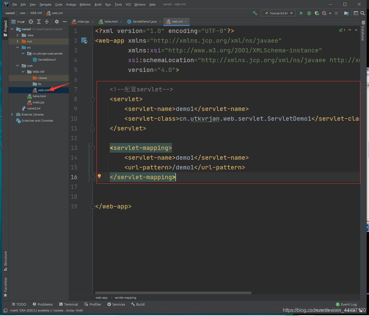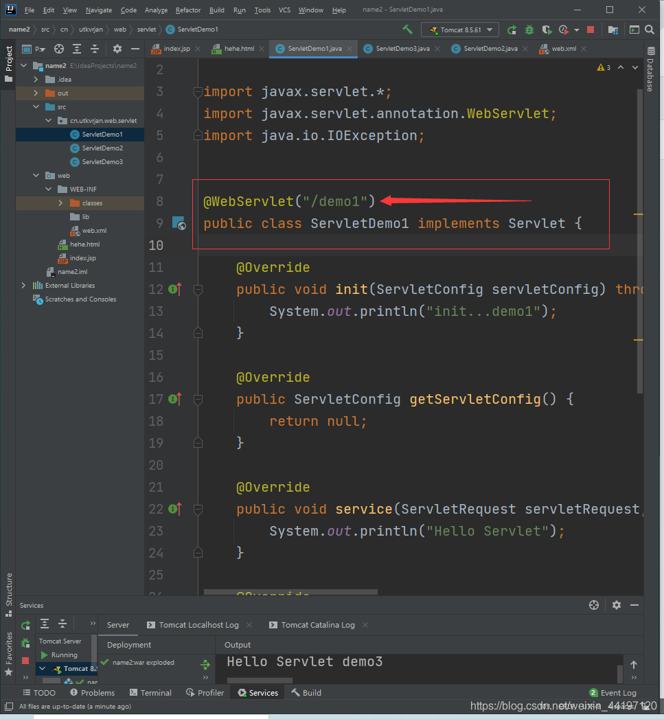 只需要在實(shí)現(xiàn)類類名上面寫(xiě)@WebServlet(urlPatterns = "/demo1")或者@WebServlet("/demo1")就能配置好啦