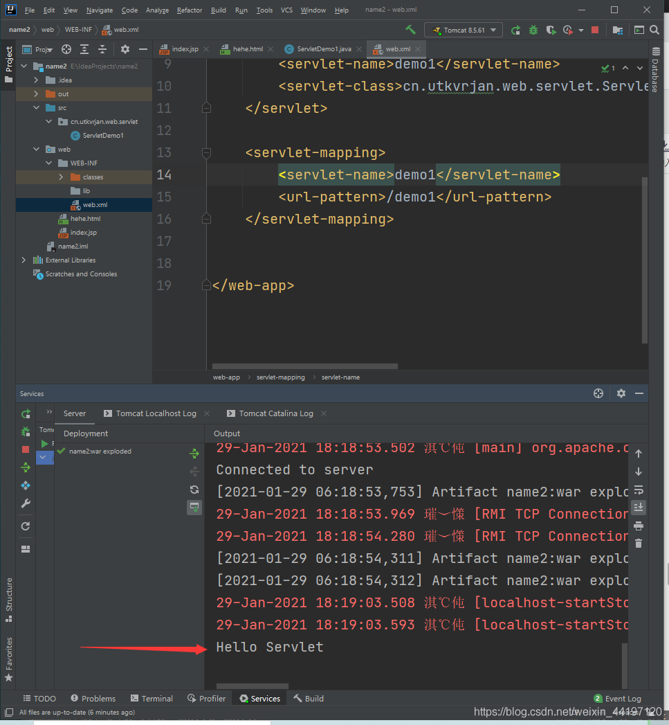 然后啟動(dòng)tomcat,并在瀏覽器輸入localhost:8080/demo1訪問(wèn)(注:這里的demo1是在配置servlet時(shí)輸入的),就能在IDEA的控制臺(tái)輸出你在servlet實(shí)現(xiàn)類的service方法下寫(xiě)的內(nèi)容,就說(shuō)明正確配置servlet。