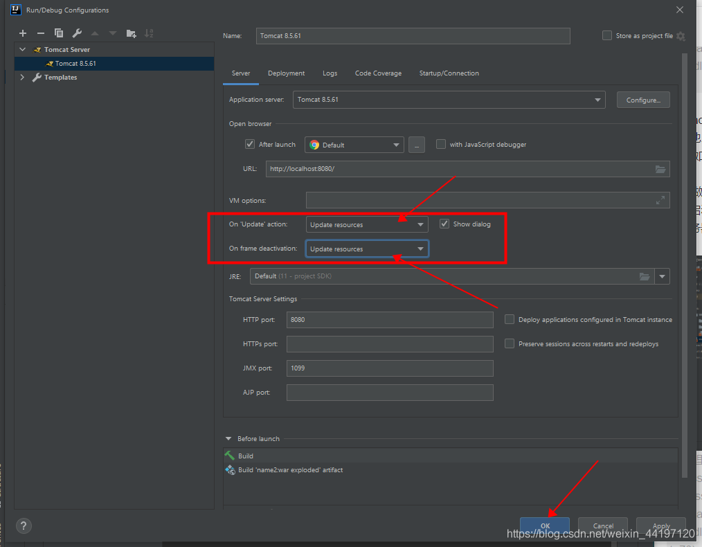 如果這里選擇Update resources and classes的話,當(dāng)改Java代碼也會(huì)重新部署,因?yàn)镴ava代碼改得比較多,這樣可能影響性能,所以不選了