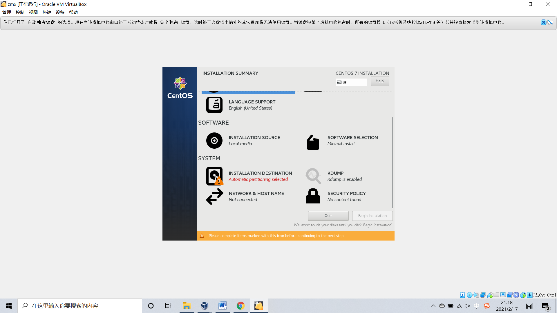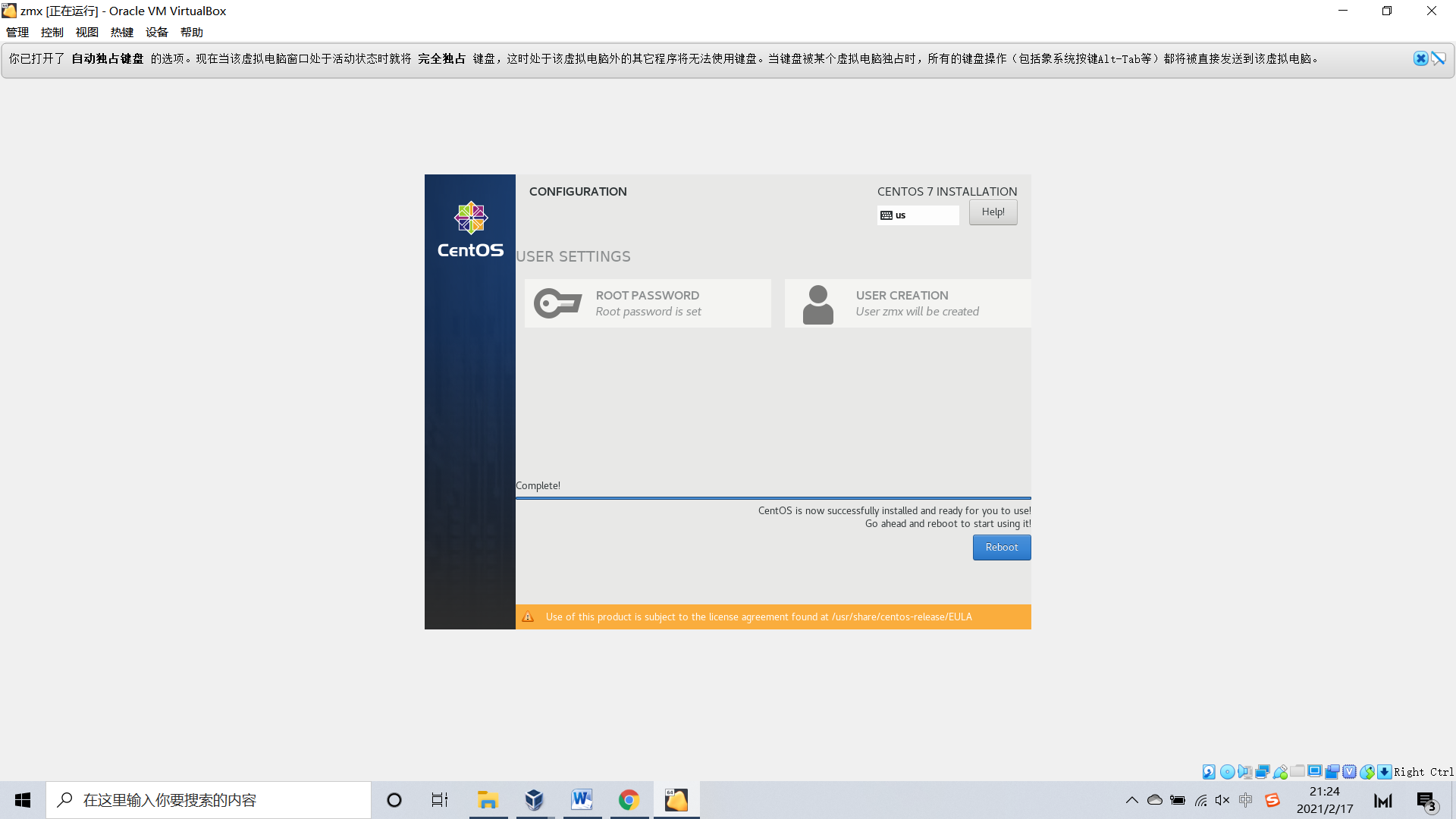 到這里centos7已經(jīng)安裝完成。不過這臺虛擬機(jī)還沒有聯(lián)網(wǎng),許多豐富的功能我們還用不到,當(dāng)務(wù)之急,自然是先聯(lián)網(wǎng)。