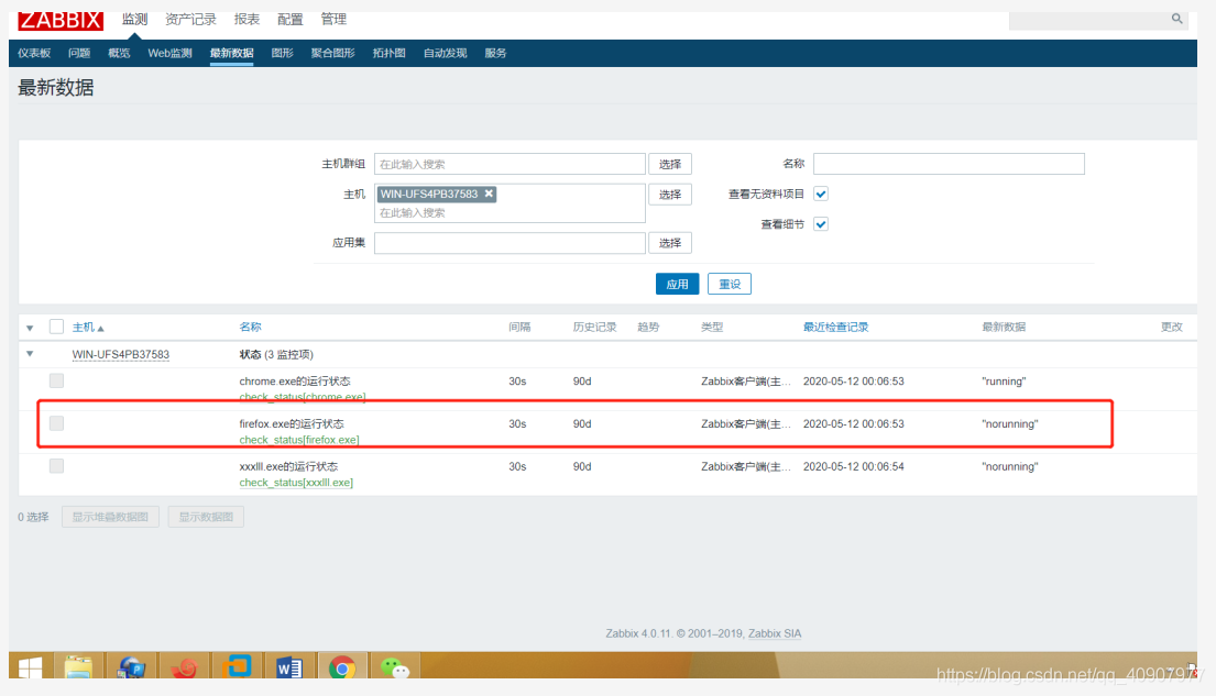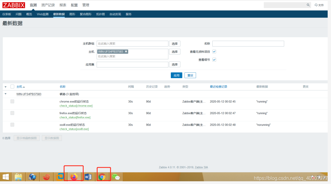 自動(dòng)發(fā)現(xiàn)填入了三個(gè)exe程序名,其中xxxll.exe為不存在的exe,為了驗(yàn)證效果,現(xiàn)在把firefox.exe程序關(guān)掉,看一下他的最新數(shù)據(jù)是否會(huì)顯示成norunning。