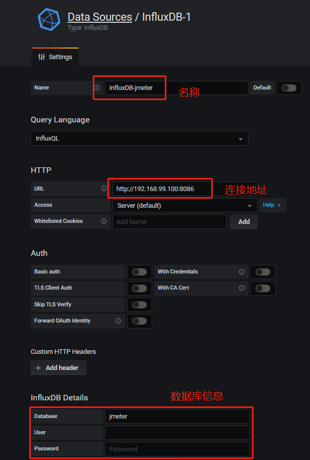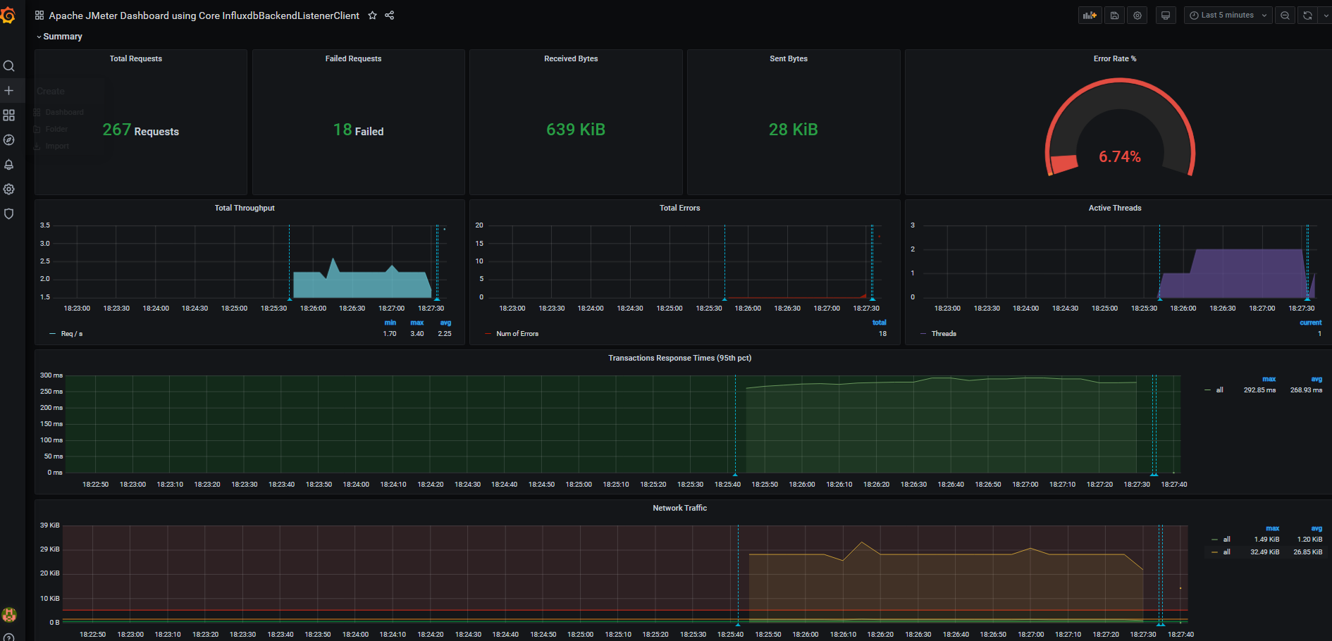 JMeter引入Backend Listener將在壓測過程中實時發(fā)送統(tǒng)計指標數(shù)據(jù)發(fā)送到Influxdb數(shù)據(jù)庫,Grafana(開源的WEB可視化看板)數(shù)據(jù)源連接到Influxdb,創(chuàng)建可視化看板,并實時獲取到測試指標數(shù)據(jù)。