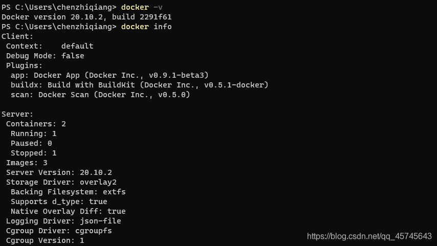 打開命令行工具輸入下面命令檢驗docker是否安裝成功: