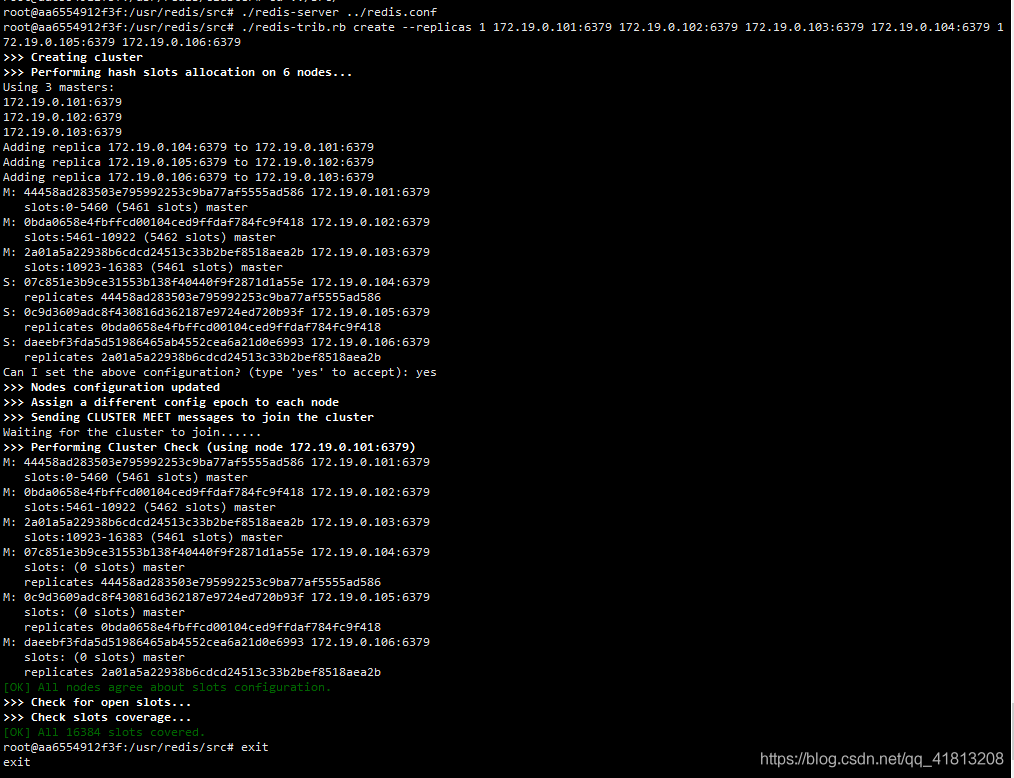 /usr/redis/src/redis-trib.rb create --replicas 1 172.19.0.101:6379 172.19.0.102:6379 172.19.0.103:6379 172.19.0.104:6379 172.19.0.105:6379 172.19.0.106:6379