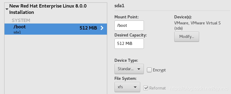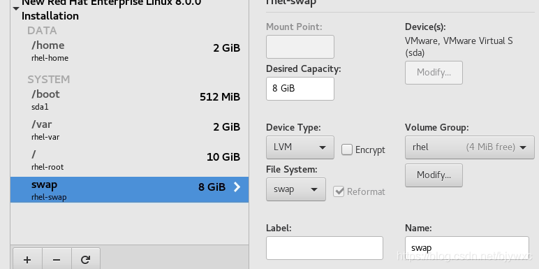 這里要注意將swap的分區(qū)file system是swap,其它的分區(qū)類型是xfs