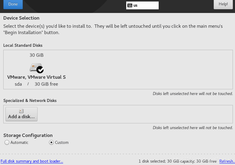 4、選擇安裝的磁盤,可以只有一個(gè)磁盤,我這里選擇自定義分區(qū)配置custom,第一次安裝的同學(xué)不熟悉linux環(huán)境的話,可以選擇自動(dòng)劃分分區(qū)automtic。選擇done。