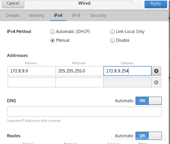 5、配置ip地址,選擇ipv4項(xiàng)目,里面有自動(dòng)獲取dhcp,手動(dòng)配置manual,按照實(shí)際情況進(jìn)行配置,并確定apply。