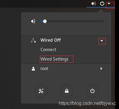 2、配置網(wǎng)絡(luò),1)點(diǎn)擊右上角的倒三角形–wired off的倒三角形–wired settings進(jìn)行設(shè)置。2)也可以在桌面右鍵選擇設(shè)置–然后選擇network網(wǎng)絡(luò)
