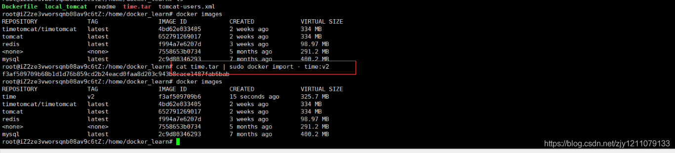 cat time.tar | sudo docker import - time:v2 //導(dǎo)入容器,導(dǎo)入得到一個(gè)鏡像,使用 帶command /bin/bash 的docker run