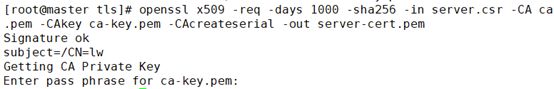 [root@master tls]# openssl x509 -req -days 1000 -sha256 -in server.csr -CA ca.pem -CAkey ca-key.pem -CAcreateserial -out server-cert.pem