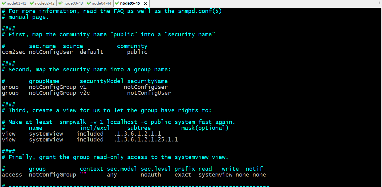 提示:以上配置表示,首先將社區(qū)名public映射為一個(gè)安全的名稱notConfigUser;其次映射安全名notConfigUser映射為組名notConfigGroup,并將安全模式v1和v2c加入到組內(nèi),這表示只要在這個(gè)組內(nèi)的成員都兼容v1 和v2c兩個(gè)版本的安全模式;第三是創(chuàng)建一個(gè)視圖,名為systemview,并配置允許那些葉子節(jié)點(diǎn)或子樹(shù)的oid加入到此視圖;最后授權(quán)notConfigGroup組里的任何用戶,用任何安全模式都對(duì)systemview擁有只讀權(quán)限,不擁有寫(xiě)權(quán)限,也沒(méi)有例外;簡(jiǎn)單點(diǎn)講以上配置表示只要是public社區(qū)的用戶,都將識(shí)別為notConfigGroup里的用戶,而對(duì)應(yīng)組里的用戶擁有systemview授權(quán)的子樹(shù)只讀權(quán)限;這里需要注意,子樹(shù)就是我們要獲取的數(shù)據(jù)對(duì)象的標(biāo)識(shí)(oid);我們授權(quán)只需要修改對(duì)應(yīng)systemview擁有那些子樹(shù)或葉子節(jié)點(diǎn)即可;授權(quán)一顆子樹(shù)意味著該子樹(shù)下的所有葉子節(jié)點(diǎn)或子樹(shù)都可以被訪問(wèn),授權(quán)一個(gè)葉子節(jié)點(diǎn)表示精確只能看到對(duì)應(yīng)葉子節(jié)點(diǎn);