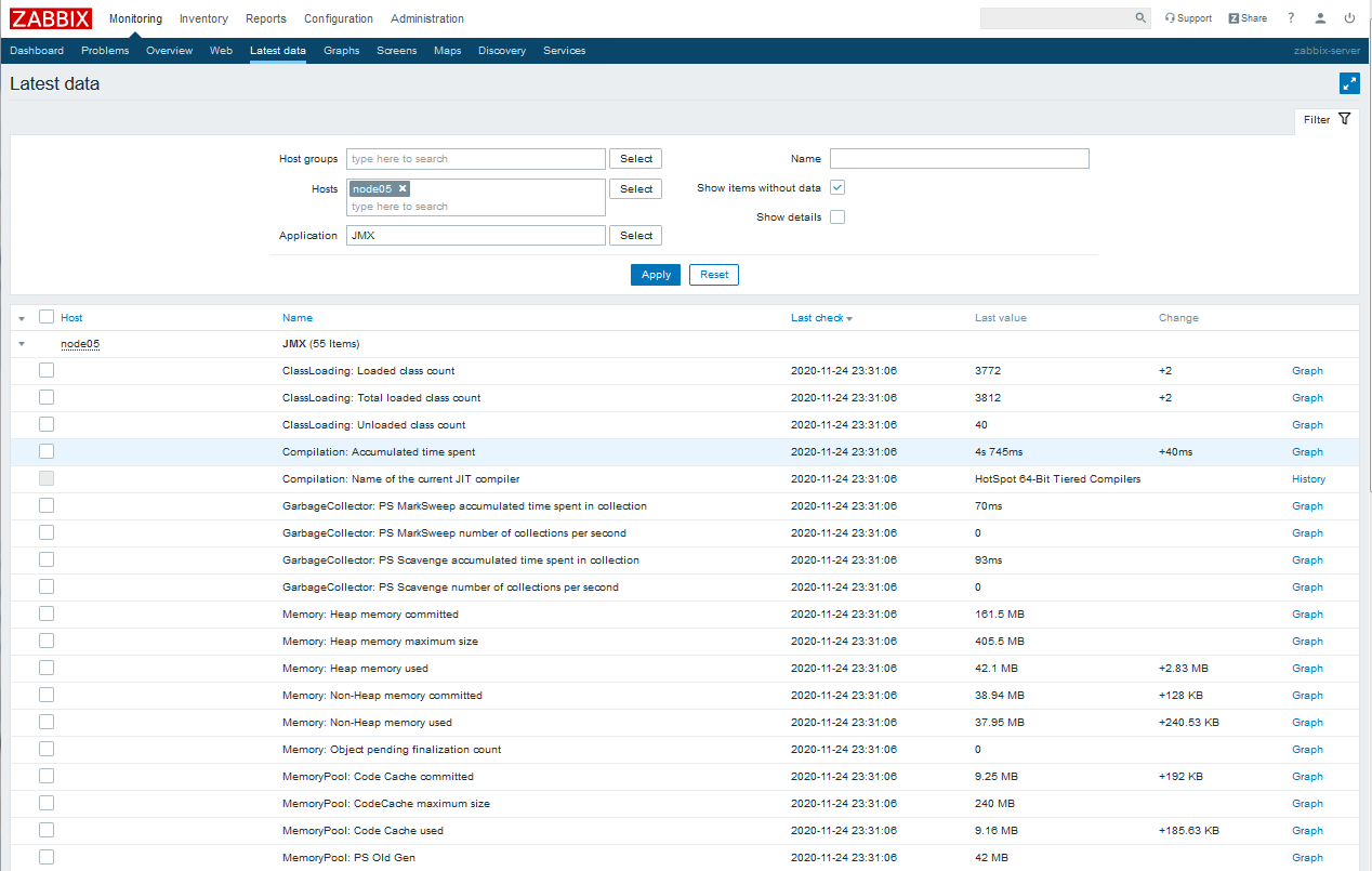 提示:可以看到我們鏈接的模板,對(duì)應(yīng)很多監(jiān)控項(xiàng)都采集到數(shù)據(jù)了;說(shuō)明我們配置使用jmx采集數(shù)據(jù)沒(méi)有什么問(wèn)題;這里需要注意我們鏈接都模版,不一定所有都監(jiān)控項(xiàng)都可以采集到數(shù)據(jù);