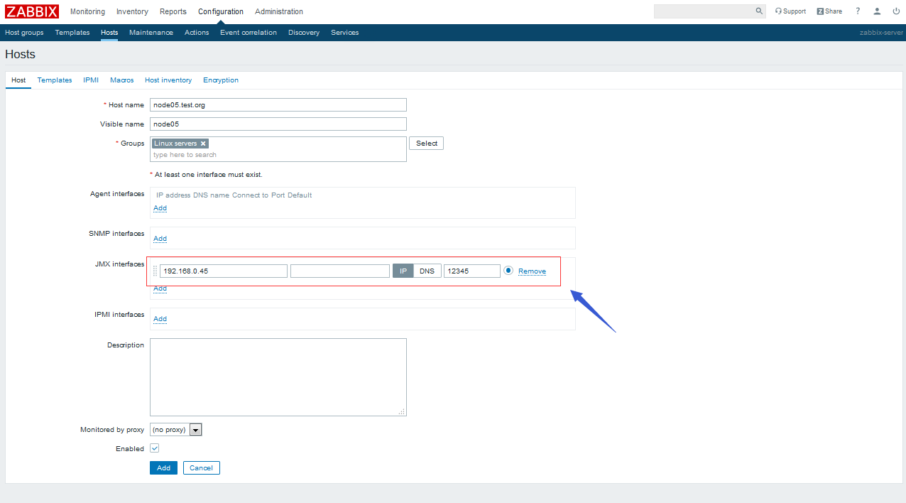 在zabbix web上添加node05并指定使用jmx接口來(lái)采集數(shù)據(jù)