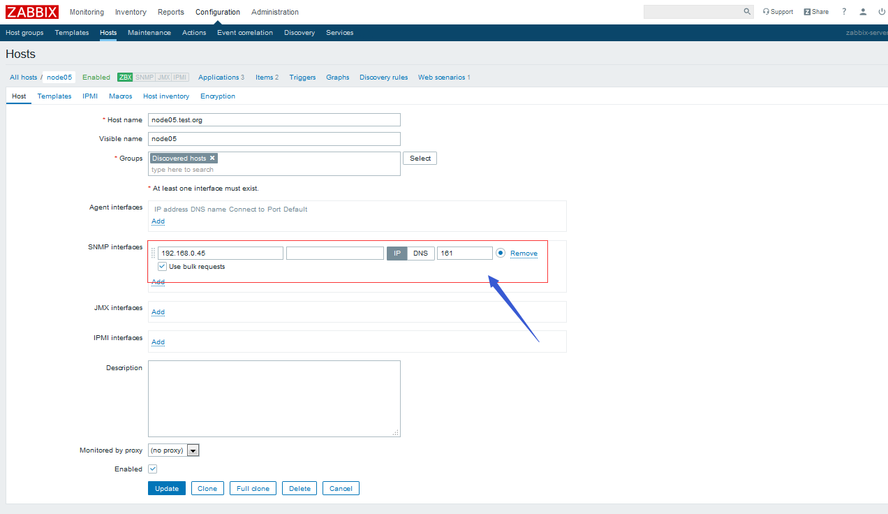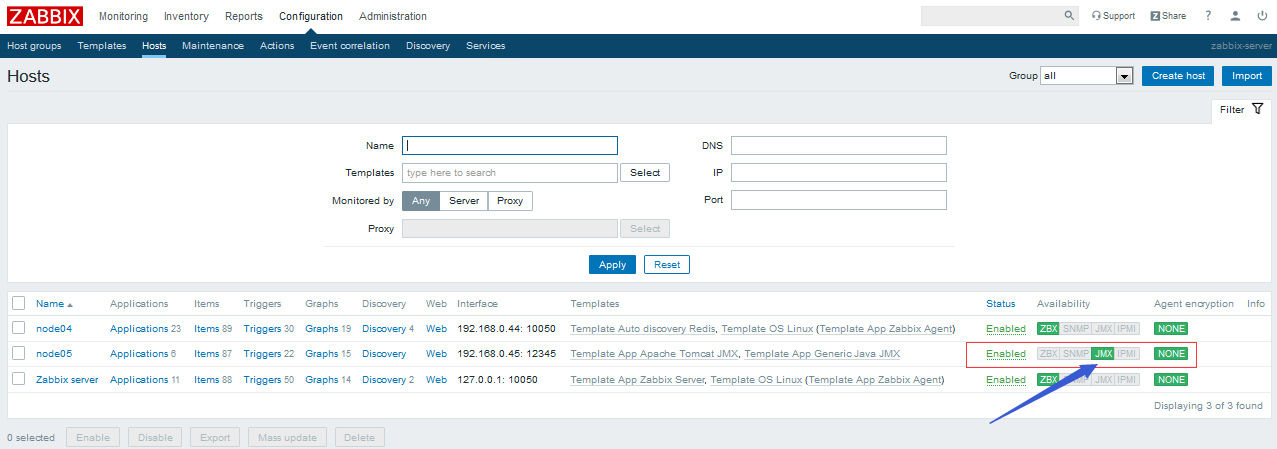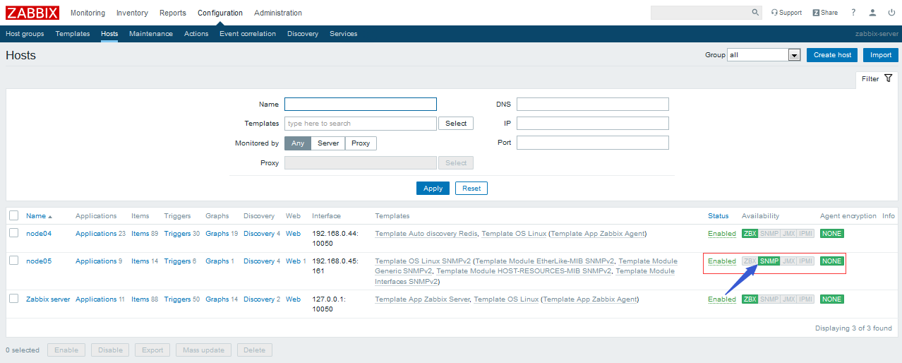 查看主機(jī)列表,看看node05對(duì)應(yīng)的SNMP信道是否變綠了?