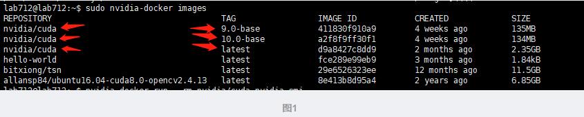 查看自己電腦安裝的鏡像文件,發(fā)現(xiàn)安裝nvidia-docker時,拉取了3個不同標(biāo)簽(TAG)的 nvidia/cuda,如下圖1所示。顯卡驅(qū)動是安裝好的,這里由于我用命令的時候沒有指定 nvidia/cuda 的標(biāo)簽(TAG),所以默認(rèn)情況下會直接調(diào)用標(biāo)簽為latest 。