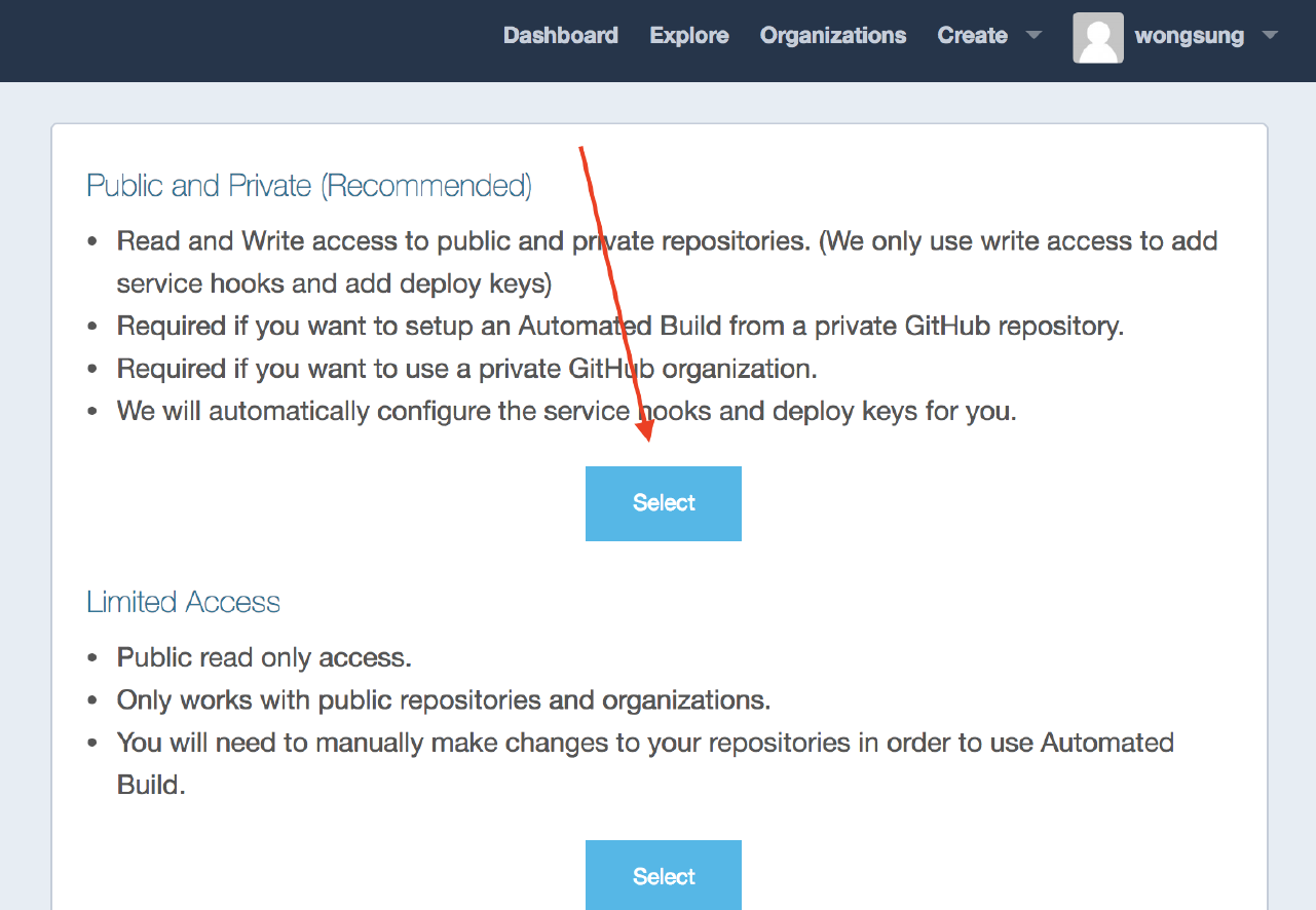 授權(quán)完成后,再次點(diǎn)擊右上角的Create按鈕,選擇Create Automated Build,在打開(kāi)的頁(yè)面中選擇GitHub,如下兩張圖: