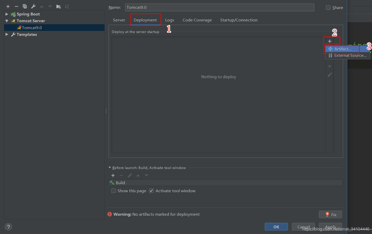 9.選擇部署選項(xiàng),然后點(diǎn)擊右邊的 + ,彈出的項(xiàng)目中選擇Artfact