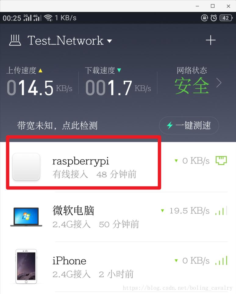 遠程連接通過路由器的管理系統(tǒng)查到樹莓派的IP地址,例如我用的是小米路由器的安卓APP,如下圖所示,紅框中就是樹莓派設備,點進去就能看到IP,假設這里IP地址是192.168.31.86:
