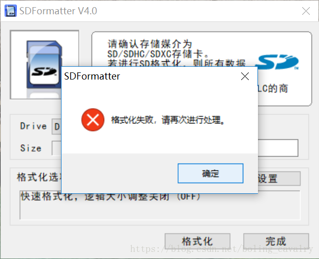 在格式化過程中可能提示格式化失敗,如下圖,這時候再格式化一次就會成功: