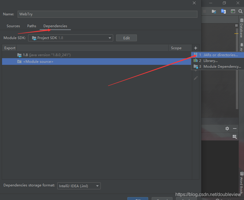 點(diǎn)擊Dependencies ->右邊的 + 號(hào) -> 1 JARS or directories