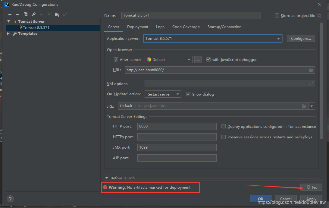 這時(shí)可以看到下方有警告Warning: No artifacts marked for deployment,直接點(diǎn)擊右邊的Fix修復(fù),之后跳到Deployment面板