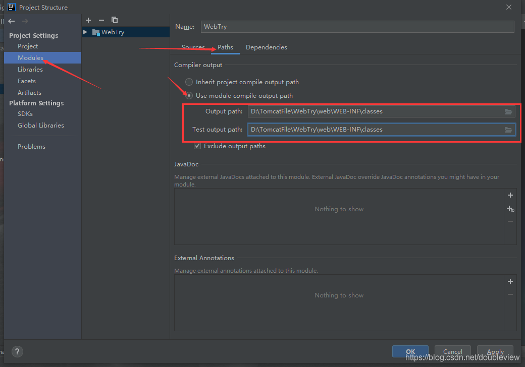 之后配置文件夾路徑;快捷鍵ctrl + shift + Alt + s -> Modules-> Paths -> 選中“Use module compile out path” -> 將Outputpath 和Test output path 路徑都設(shè)置為classes文件夾