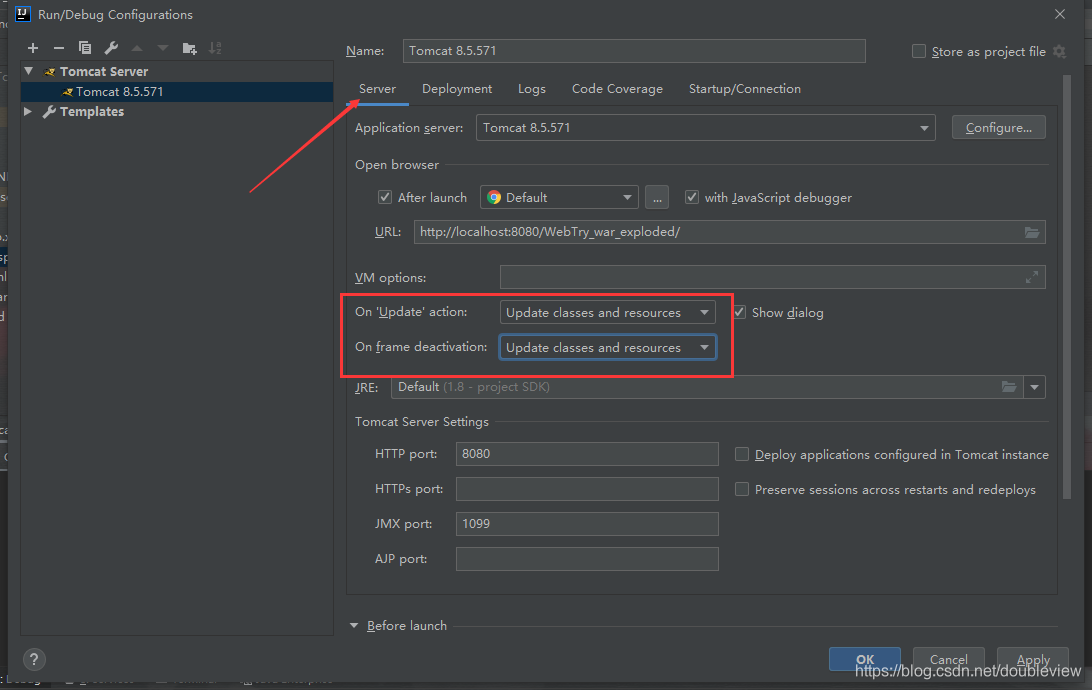 回到sever面板,將On ‘update' action和On frame deactivation改為update classes and resources ,保存退出