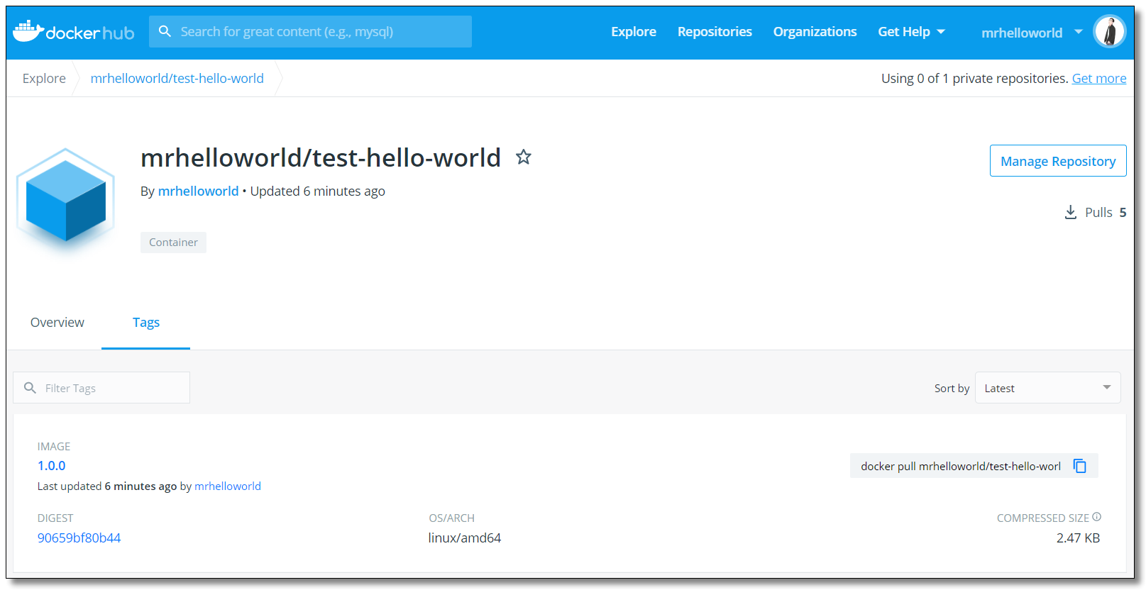 docker tag hello-world:latest mrhelloworld/test-hello-world:1.0.0