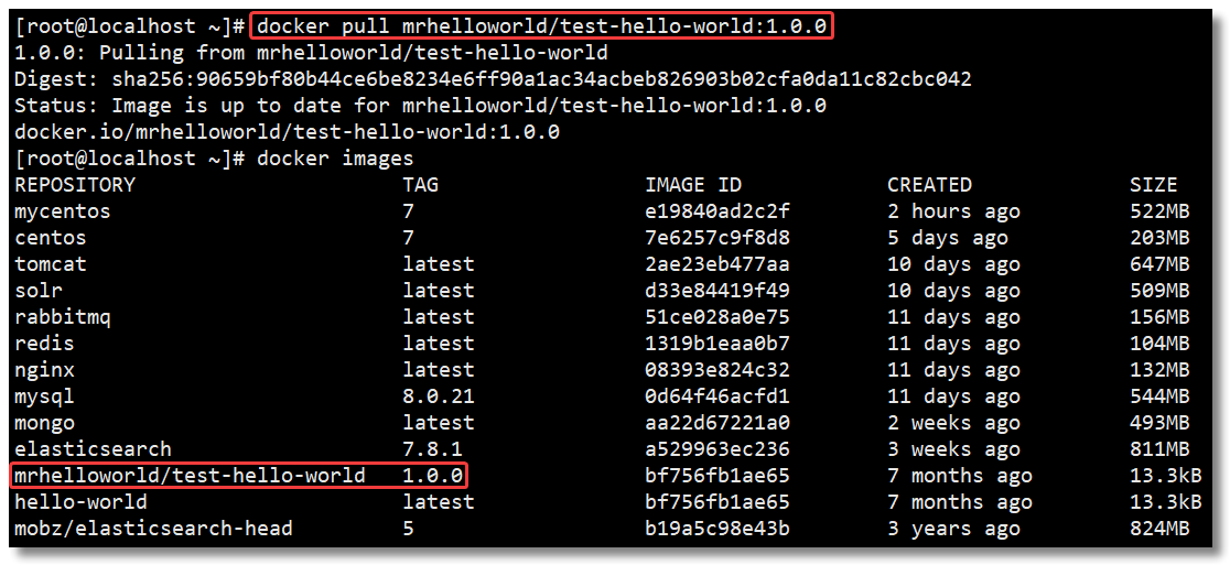 通過 docker pull mrhelloworld/test-hello-world:1.0.0 測(cè)試鏡像是否可以拉取。