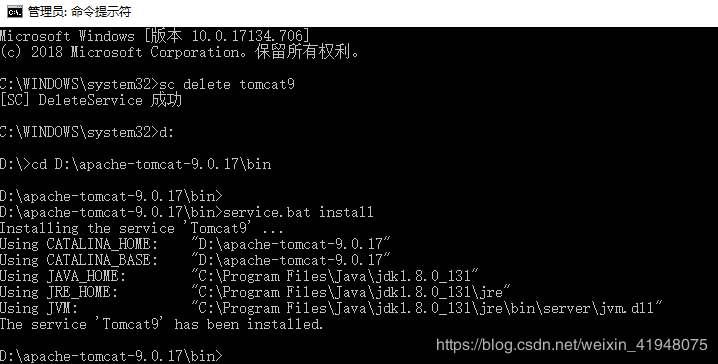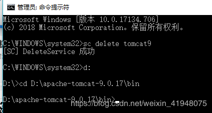 3.以管理員身份運行cmd,執(zhí)行命令sc delete tomcat9(我之前裝的tomcat版本是tomcat89.0.17,根據(jù)你自己的版本決定),刪除tomcat service