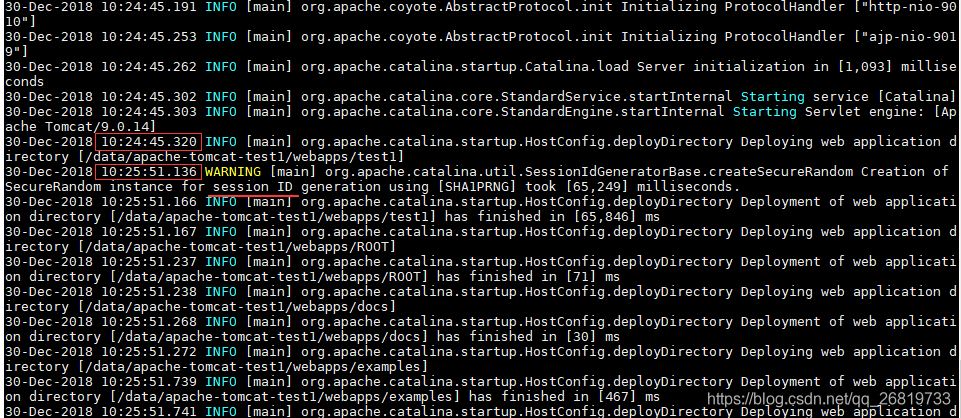 可以看到因為生成session ID用了1分06秒,太久了,導致應用deploying整體的時間大大增加,這個問題是可以解決的,可以再啟動的時候增加jvm參數(shù)-Djava.security.egd=file:/dev/./urandom,但是這樣做應用產(chǎn)生隨機數(shù)的能力被減弱,或者說隨機不夠均勻,對于經(jīng)常使用加密的應用可能有安全影響。