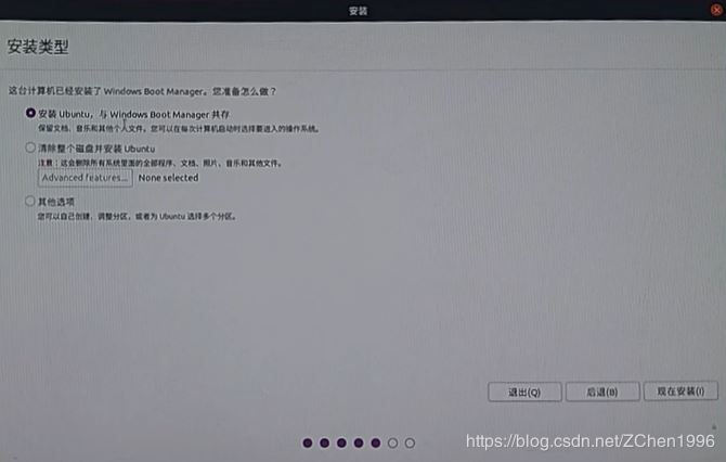 選擇安裝類型,安裝Ubuntu,與 Windows Boot Manager 共存(好多安裝教程不建議選擇此項(xiàng),說有問題,反正從16.04開始我都是這么裝的,沒出問題),網(wǎng)上也有好多選擇其他選項(xiàng)安裝的,如需要可自行查找,反正我是嫌麻煩(主要是懶)不想自己分區(qū)。