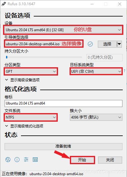 插入U(xiǎn)盤, 運(yùn)行 rufus-3.10.exe,按照下面選擇,然后點(diǎn)擊開始,等待完成即可