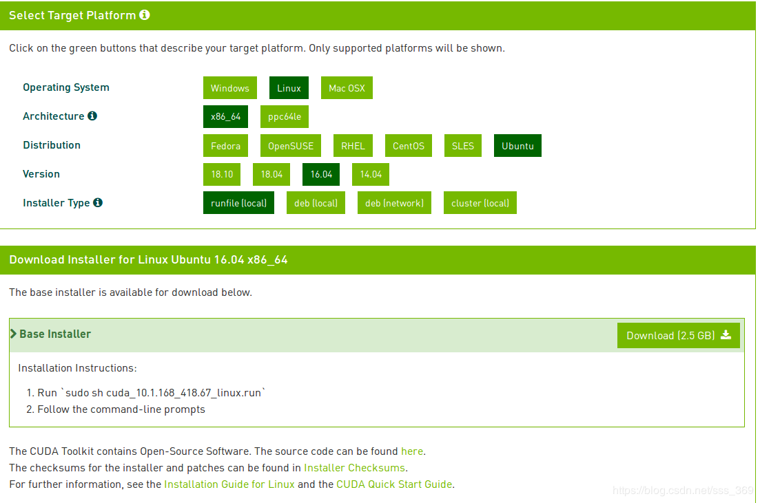 英偉達(dá)官網(wǎng)鏈接:https://developer.nvidia.com/cuda-downloads?target_os=Linux&target_arch=x86_64&target_distro=Ubuntu&target_version=1604&target_type=runfilelocal