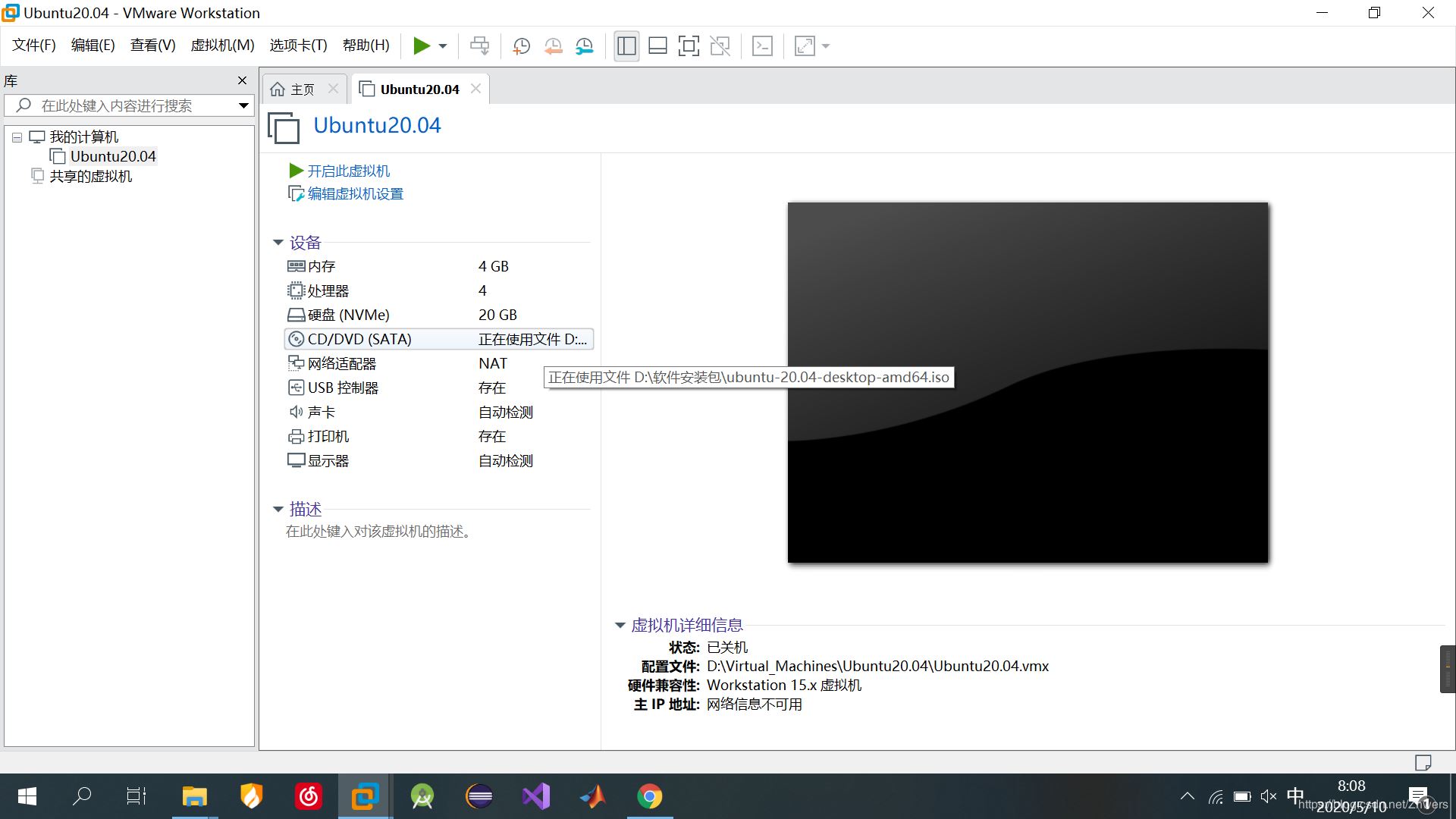 16、 選擇“新CD/DVD(SATA)”,在右側(cè)選擇“使用ISO映像文件”,然后點(diǎn)擊“瀏覽”,找到之前下好的Ubuntu20.04安裝包。然后點(diǎn)擊“關(guān)閉”