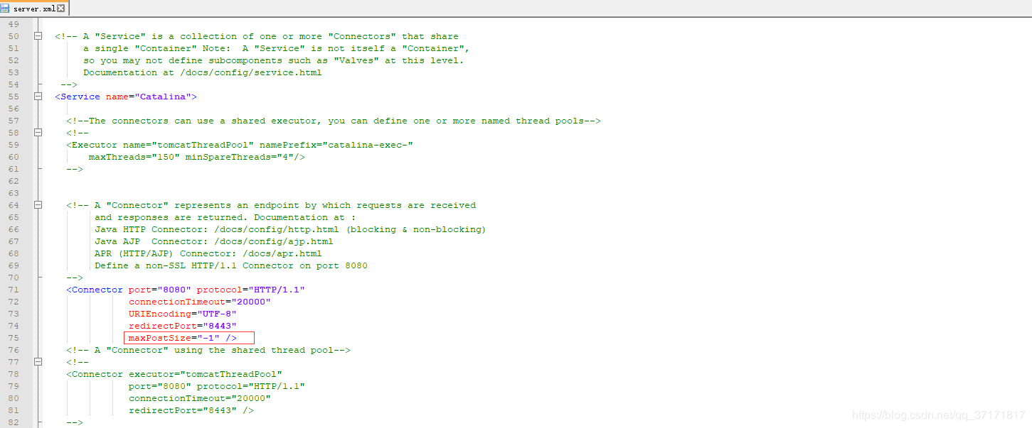 找到tomcat目錄下的/conf/server.xml,為其添加maxPostSize參數(shù)