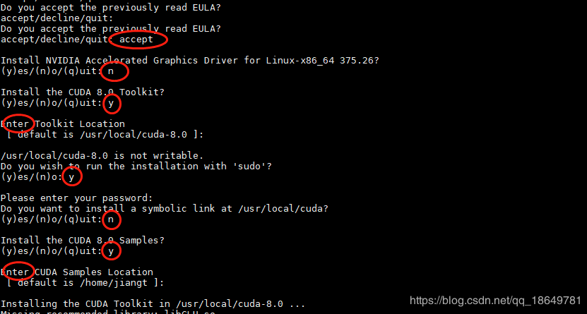 當(dāng)你跳過了介紹文檔之后,接下來會(huì)出現(xiàn)一些需要你選擇的選項(xiàng):(每一步對應(yīng)的輸入都在下圖中用紅色的圓圈標(biāo)注出來了,在這里解釋一點(diǎn):Driver一定要選擇 n,因?yàn)槟阒坝醒b的支持CUDA9.0的驅(qū)動(dòng),所以就不用在裝新的)