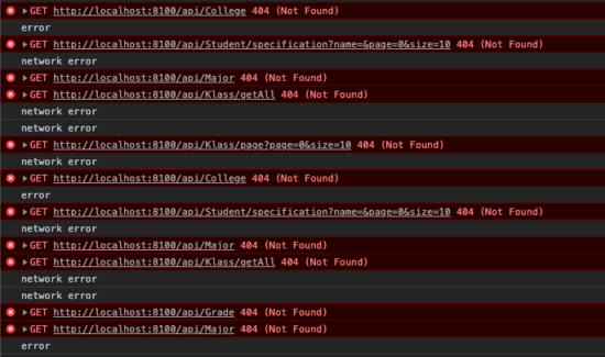 接下來出現(xiàn)了問題:前臺發(fā)起的請求,只有極少數(shù)能被后臺接收到,大部分都是404,隨著在瀏覽器中的點(diǎn)擊,控制臺不斷的出現(xiàn)404。