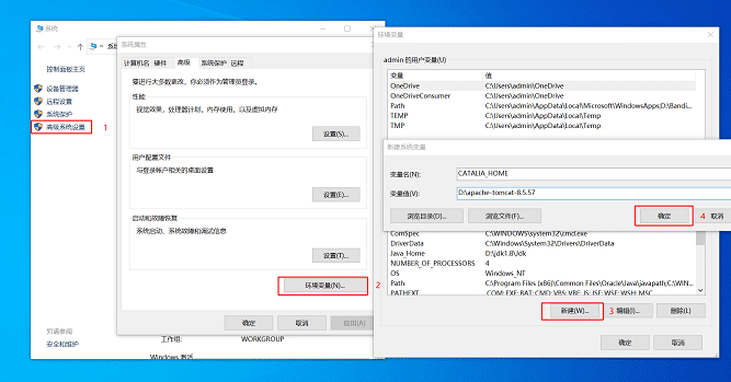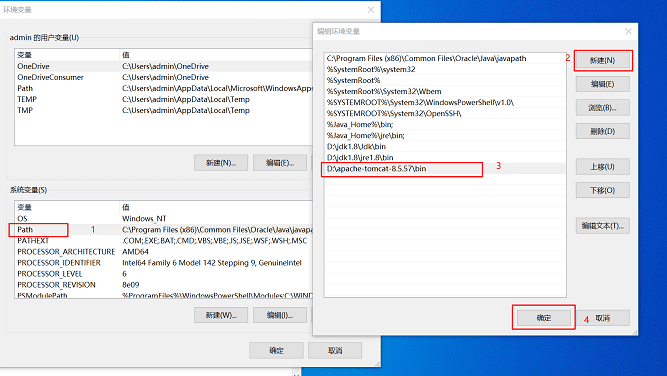 選中Path變量,雙擊Path變量。彈出框中選擇【新建】,在光標(biāo)閃爍的空白處填寫:D:\apache-tomcat-8.5.5\bin